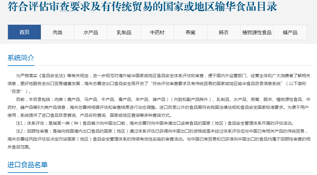 2. 向中國出口食品的國家或地區(qū)經(jīng)過我國食品安全管理體系和食品安全狀況評估、審查。部分產(chǎn)品需在符合評估審查要求及有傳統(tǒng)貿(mào)易的國家或地區(qū)輸華食品目錄內(nèi)(查詢網(wǎng)址:http://43.248.49.223/index.aspx)。