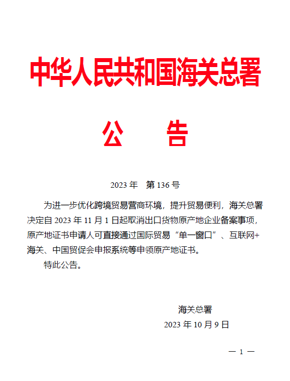 關于取消出口貨物原產(chǎn)地企業(yè)備案事項的公告